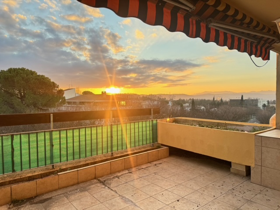 Bel appartement lumineux situé au 3e étage avec ascenseur, offrant une vue dominante et dégagée sur la sainte-victoire. Il se compose d'un hall d'entrée, d'un séjour avec cuisine semi ouverte donnant sur une très grande terrasse, idéale pour profiter du panorama. Le coin nuit comprend deux chambres, dont une avec accès direct sur la terrasse, un dressing, une salle d'eau et des wc séparés. l'appartement est climatisé. Une cave et un garage complétent ce bien. Charges annuelles: 2150 euros. DPE en cours.