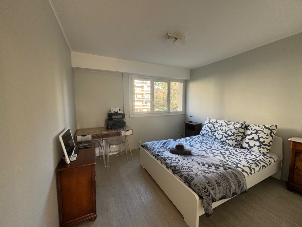Aix en Provence. Exclusivité, Centre ville à pied. A proximité immédiate du parc de la Torse, dans une résidence sécurisée de 485 lots avec piscine et gardien, au calme et situé au 2ème étage avec ascenseur, appartement de 63 m² comprenant un double séjour de 30 m² exposé Sud, climatisé et donnant sur terrasse de 12 m² bénéficiant d'une belle vue dégagée, une cuisine indépendante meublée avec loggia, une chambre avec placard et une salle de bains. Parking Extérieur privatif, une cave, Charges/an: 1576€.
