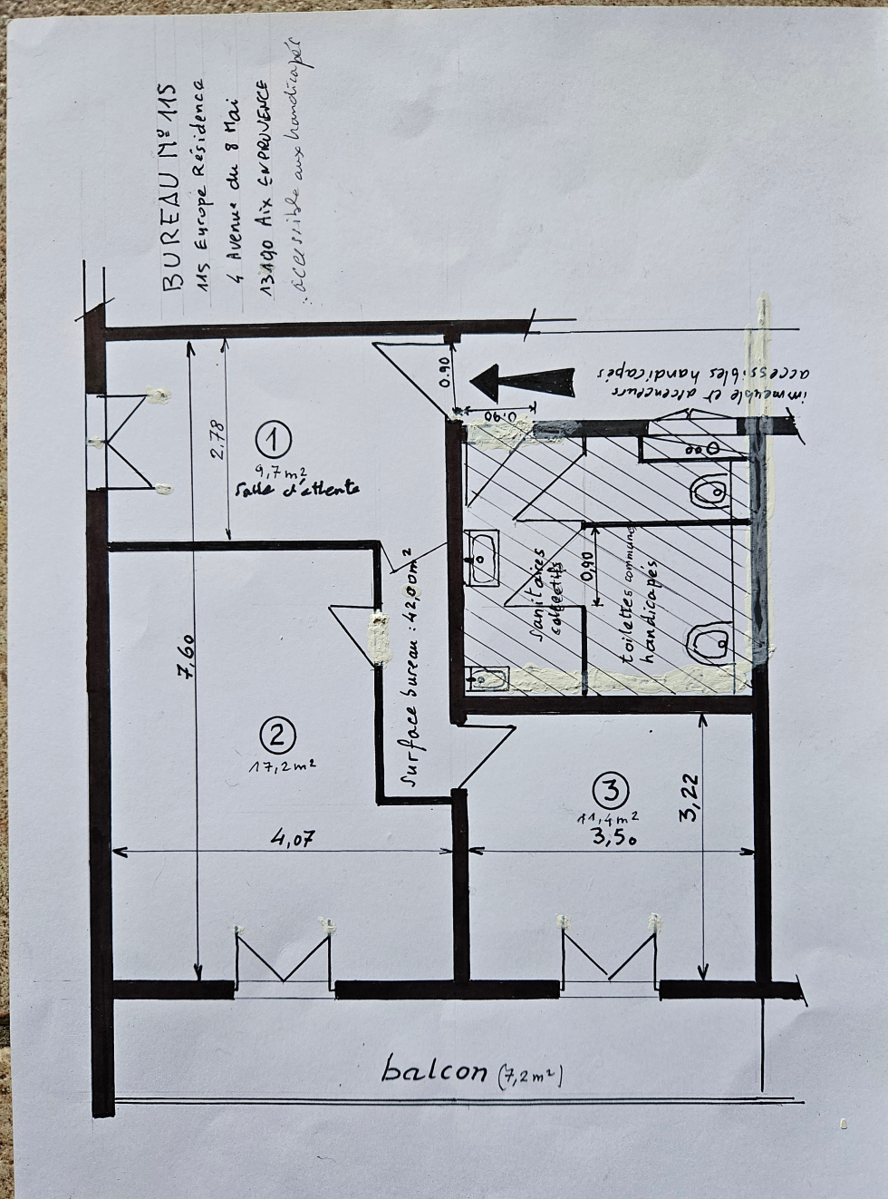 Bureau ou cabinet professionnel de 3 pièces d’une superficie de 42 m² avec balcon, situé au 3? étage d’un immeuble équipé de deux ascenseurs. L’étage accueille 14 bureaux professionnels et se trouve au-dessus de Super U, à 800 mètres des Allées Provençales. Le local dispose du chauffage central collectif, d’une climatisation réversible, de la fibre optique et de sanitaires communs aux bureaux de l’étage. Idéalement situé à proximité immédiate de tous services et commerces (supermarché, banques, marché, bus…), il convient parfaitement à toute profession libérale (médicale, avocat, ingénierie, etc.). Parking public en sous-sol. Bail 3/6/9. Loyer mensuel de 740 € + 180 € de charges (chauffage inclus). Dépôt de garantie : 2 mois. Disponible à partir du 01/05/2026. Pour tout renseignement complémentaire, veuillez contacter l’agence au 06 22 84 26 55.