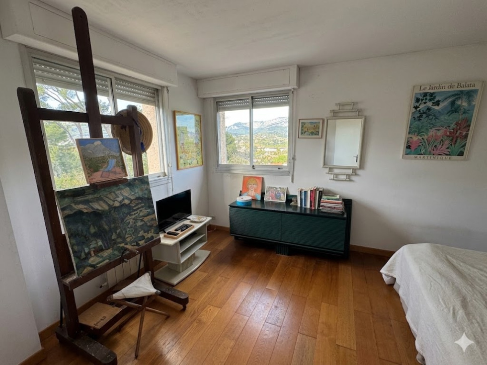 RARE, Toulon/La Garde, dans le quartier prisé de Ste Marguerite, au calme et à deux pas de la mer, en position dominante avec vue panoramique sur le mont Faron et le mont Coudon, sur un terrain paysagé de 2109 m², spacieuse maison d'architecte de 151 m² composée d'un double salon très lumineux, une salle à manger, une cuisine équipée, 5 chambres, une salle de bains, une salle d'eau/WC, un WC indépendant, dressing. Studio indépendant de 27 m² avec salle d'eau et kitchenette. Un vaste espace extérieur avec plusieurs terrasses, piscine avec plage immergée, traitée au sel. Garage double.